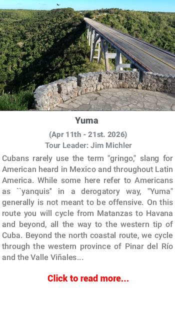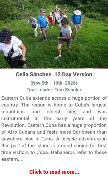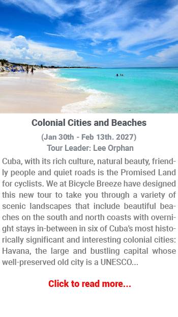 We have various upcoming cycling tours in Cuba. You can also browse our previous tours. If you find an interesting one, you should know that with a group of 10 or more riders, Bicycle Breeze can offer the ability to implement any of our past tours, or customize it to suit your needs. Contact us to start planning your next great adventure.